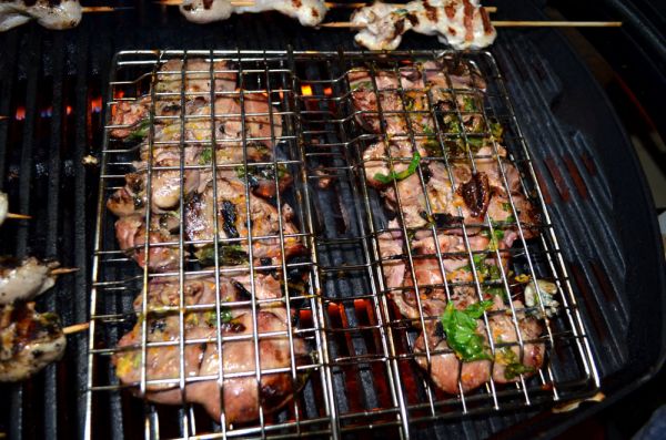 צולים כ-4 דקות מכל צד. לא הופכים יותר מפעם אחת ורצוי לא לצלות יותר מאשר הזמן המצויין, אחרת הכבדים מתייבשים במהירות. במהלך הצלייה, מברישים את הכבדים כמה פעמים במרינדה שנשארה, עד כדקה לפני סיום הצלייה (כדי שהחיידקים שהצטברו במרינדה יפסיקו לתפקד בחום הצלייה).