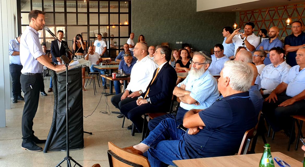 בתמונה משמאל לימין: יאיר רביבו, ראש עיריית לוד; איתן פטיגרו, ראש מועצת שוהם; אלי כהן, שר הכלכלה; הרב דוד סתיו, רבה של שוהם; מרחב זוארץ.