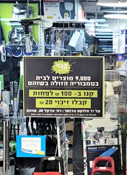 מול הצעצועים התרשמנו מחנות “צבע טרי”. 9,000 מוצרים לבית ב“טמבורייה הזולה בשוהם” כפי שמכריז השלט בחלון הראווה, ועל כל קנייה ב-100 ₪ נזוכה ב-20 ₪.