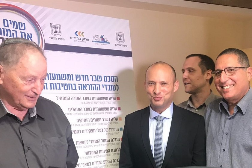 בשבוע שעבר התקיים טקס החתימה על הסכם השכר החדש למורים בחטיבה העליונה. ההסכם הגיע לאחר שנה של מאבק ממושך שלווה בעיצומים ובשביתות כלליות ולפי אזורים גאוגרפיים. ההסכם מציג שיפור משמעותי בתנאי ההעסקה של המורים והחתימה עליו הגיעה בעקבות התחייבות משרד החינוך להעניק שיפוי מלא בגין הסכמי השכר. השתתפו בטקס החותמים על ההסכם - עופר בן אליעזר, ראש ועדת הסכמי שכר במרכז השלטון המקומי, וחגית מגן ראש מינהל הסכמי עבודה ושכר מרכז השלטון המקומי – חתמו על ההסכם יחד עם שר החינוך נפתלי בנט, שר האוצר משה כחלון, רן ארז יו"ר ארגון המורים, שמואל אבואב מנכ"ל משרד החינוך וערן יעקב, הממונה על השכר באוצר.